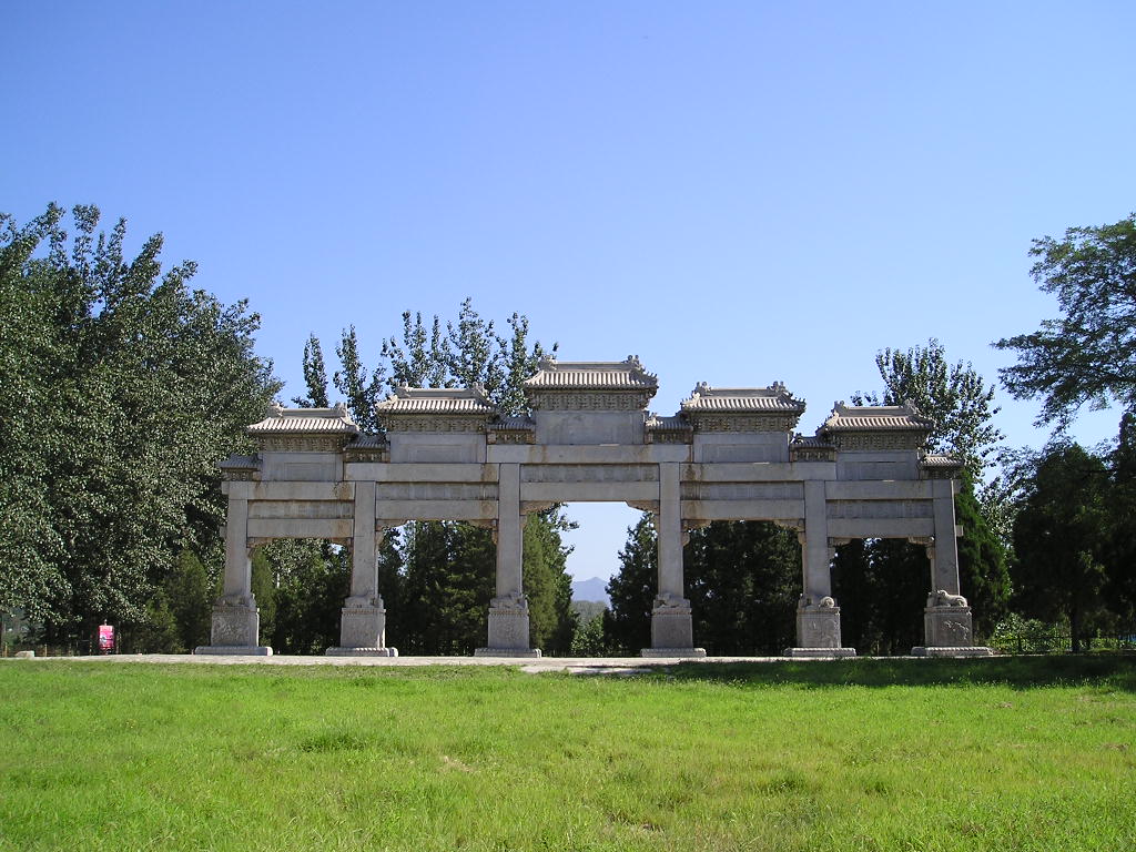 大紅門 坐落于陵區(qū)的正南面,門分三洞,又名大宮門,為陵園的正門。大門兩旁原各豎一通石碑,上刻"官員人等至此下馬"字樣。凡是前來祭陵的人,都必須從此步入陵園,以顯示皇陵的無上尊嚴(yán)。大門兩側(cè)原設(shè)有兩個(gè)角門,并連接著長(zhǎng)達(dá)80華里的紅色圍墻。在蜿蜒連綿的圍墻中,另設(shè)有一座小紅門和十個(gè)出入口,均派有重兵駐守,是百姓不可接近的禁地?,F(xiàn)在這些圍墻都早已坍塌,有些殘跡尚依稀可辨。