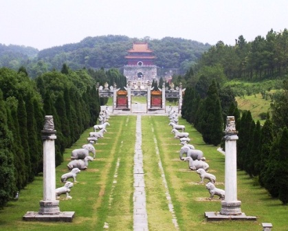 石雕群 是陵前放置的石雕人、獸,古稱石像生(石人又稱翁仲)。從碑亭北的兩根六角形的石柱起,至龍鳳門止的千米神道兩旁,整齊地排列著24只石獸和12個(gè)石人,造型生動(dòng),雕刻精細(xì),深為游人所喜愛。其數(shù)量之多,形體之大,雕琢之精,保存之好,是古代陵園中罕見的。石獸共分6種,每種4只,均呈兩立兩跪狀。將它們陳列于此,賦有一定含義。例如,雄獅威武,而且善戰(zhàn);獬豸為傳說中的神獸,善辨忠奸,慣用頭上的獨(dú)角去頂觸邪惡之人。獅子和獬豸均是象征守陵的衛(wèi)士。麒麟,為傳說中的"仁獸",表示吉祥之意。駱駝和大象,忠實(shí)善良,并能負(fù)重遠(yuǎn)行。駿馬善于奔跑,可為坐騎。石人分勛臣、文臣和武臣,各4尊,為皇帝生前的近身侍臣,均為拱手執(zhí)笏的立像,威武而虔誠。在皇陵中設(shè)置這種石像生,早在兩千多年前的秦漢時(shí)期就有了。主要起裝飾點(diǎn)綴作用,以象征皇帝生前的儀威,表示皇帝死后在陰間也擁有文武百官及各種牲畜可供驅(qū)使,仍可主宰一切。