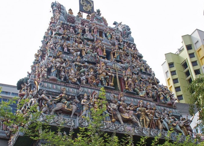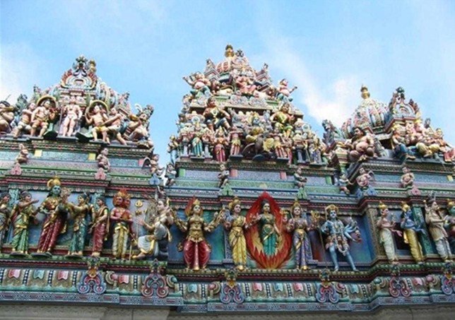 維拉瑪卡里雅曼興都廟(Sri Veeramakliaman Temple)建于1855年。特殊的彩繪門樓屬典型的南印度建筑風(fēng)格,門上高聳的塔樓上裝飾許多立體的彩色神像,廟里則是供奉主掌生死的"卡莉女神"(Kali)。雕刻在門樓上的印度教諸神與圣物牛、斗士等,在太陽(yáng)的照耀下閃閃發(fā)光,耀人眼目。寺廟周圍的墻壁,都被涂成紅白色,極富喜慶氣氛。