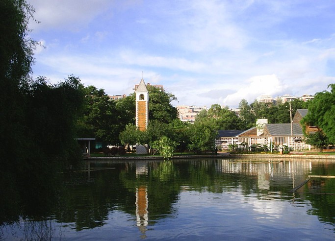 位于玉溪市州城西北10公里奇黎山下的九龍池,又名奇黎溪, 是當(dāng)?shù)刂募丫皠俚刂弧?據(jù)《重修九龍池碑記》載, 寺廟初創(chuàng)于清朝之前, 幾經(jīng)擴(kuò)建,到公元1729年(雍正七年),又“新作石橋,長(zhǎng)虹臥波,幾于騰空直上。繼修大寺閣,燃然一新,儼若普陀”??梢?jiàn), 200多年前,九龍池廟宇已頗具規(guī)模。 九龍池風(fēng)光,最吸引人的地方,首先是那潭十分清澈明凈的池水。乾隆《新興州志》描寫(xiě)其水,從“巖石間潺潺流出,聚為一泓,清可鑒發(fā)”。不論春夏秋冬,無(wú)數(shù)游魚(yú),搖尾相戲。晴日,池旁斑駁的樹(shù)影清晰如畫(huà)地印在池中;微風(fēng)吹來(lái),則漣漪輕蕩,樹(shù)影碎散,魚(yú)群晃動(dòng),別有佳趣。有池子四周,設(shè)有欄桿。 池上,一橋飛跨正中,橋洞門(mén)頭上,刻有“九龍池”三字。龍?zhí)兜某鏊?,比本地其他泉池,都要大得多,歷來(lái)是灌溉玉溪壩子“四十二屯”萬(wàn)畝良田的重要水源之一。故前人有詩(shī)吟道:“山滿青光水滿池,滔滔利澤本無(wú)私。未知百里臨民侯,可似九龍作雨時(shí)。”九龍池的山巖峭壁聳峙, 層巒疊嶂。 沿著池畔臺(tái)階拾級(jí)而上,在險(xiǎn)峻的林壑之巔,建有樓臺(tái)亭閣,雕梁畫(huà)棟,金碧輝煌。大觀樓、聽(tīng)泉樓、三圣閣、大士閣、文星閣等,均有詩(shī)詞對(duì)聯(lián)可以觀賞。“欲窮千里目,更上一層樓”。文星閣位置最高,巍峨矗立,直插云霄。只要登樓遠(yuǎn)眺,眾山皆小,翡翠般的玉溪壩子,可盡收眼底。遠(yuǎn)處山川,連綿不絕,此起彼伏; 星羅棋布的村舍,縷縷炊煙,裊裊升起;縱橫交錯(cuò)的林蔭大道,車(chē)水馬龍,往返不息。視近處,龍池周?chē)?,古木參天,郁郁蔥蔥,鳥(niǎo)語(yǔ)花香,林濤陣陣。池子?xùn)|邊的平場(chǎng)上,有古戲臺(tái)一座,至今尚存。歷史上,每年春節(jié)在此大鬧花燈是個(gè)傳統(tǒng)。四面八方來(lái)游玩的人,真是人山人海。 除池、 亭、 山、水之外,九龍池還有上中下松園,三園相近。園內(nèi)的云南巨松,拔地而起,蒼勁挺拔,高達(dá)十?dāng)?shù)丈,相傳為明代寺內(nèi)老僧所值。座落在龍池下面的飛井海(水庫(kù)),水面寬闊,碧波如玉。西岸的農(nóng)村,坡坡桃林,處處綠蔭。山道彎彎,阡陌相連。當(dāng)盛產(chǎn)飛井桃,其味甜美,遠(yuǎn)近聞名。近年來(lái),當(dāng)?shù)厝嗣裾畵芸钸M(jìn)行修復(fù),建立了專門(mén)管理林園機(jī)構(gòu),使古老的九龍池恢復(fù)了青春。