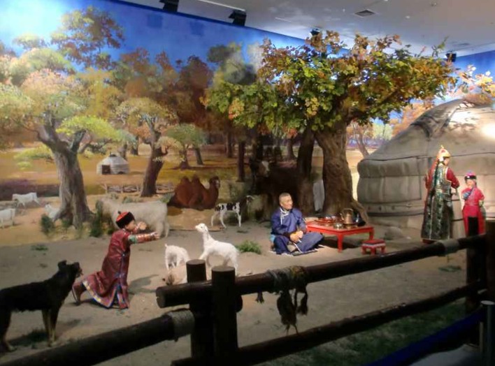 博物館阿拉善民族民俗展廳,建筑面積1300平米,展有款式多樣的阿拉善蒙古族服飾、代表禮儀至尊的阿拉善烤全羊、聞名遐邇的阿拉善蒙古族養(yǎng)駝馴駝技藝、工藝精湛的阿拉善仿古地毯、悠揚(yáng)綿長(zhǎng)的長(zhǎng)調(diào)民歌、英武雄健的沙力搏爾式摔跤和神奇精湛的阿拉善蒙醫(yī)蒙藥等139件裝飾實(shí)物和民間藝術(shù)品。
