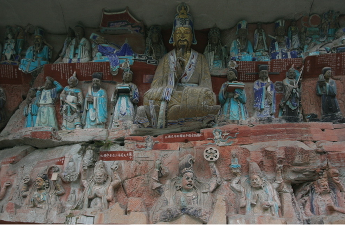 它是一個九層的遮檐,也叫“北大像”,正處在崖窟的中段,與崖頂?shù)雀撸《雺延^。其木構為土紅色,檐牙高啄,外觀輪廓錯落有致,檐角系鈴,隨風作響。其間有彌勒佛坐像,高35.6米,由石胎泥塑彩繪而成,是中國國內僅次于樂山大佛和榮縣大佛的第三大坐佛。容納大佛的空間下部大而上部小,平面呈方形。樓外開兩條通道,既可供就近觀賞大佛,又是大佛頭部和腰部的光線來源。這座窟檐在唐文德元年(888年)以前就已存在,當時為5層,北宋乾德四年(966年)和清代都進行了重建,并改為4層。1935年再次重修,形成現(xiàn)在的9層造型。