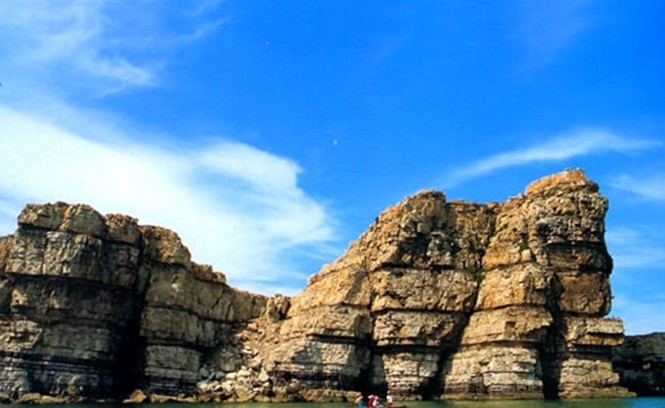 九丈崖位于北長(zhǎng)山島的西 北角,西依珍珠門水道,北鄰國際航線長(zhǎng)山水道,距長(zhǎng)島縣城11公里。山崖險(xiǎn)峻,水深流急,巖礁棋布,自然景觀獨(dú)樹一幟。崖壁綿延400余米,尤以其崖壁罕見的石質(zhì)組合和高峻險(xiǎn)要而著稱,版權(quán)所有山東聊城聊之旅國際旅行社有限公司,轉(zhuǎn)載必究!在全國眾多海蝕崖中獨(dú)占鰲頭。景區(qū)集山、海、礁、崖、洞及古跡于一體,融奇、雄、秀、美、險(xiǎn)、神于一身,具有很高旅游和美學(xué)價(jià)值。九丈崖主要景點(diǎn)有:峭壁燕梭(九丈崖),高69.7米,是一綿延幾百米的巨崖,由于千萬年來風(fēng)浪的侵蝕,石崖漸成了上凸下凹之勢(shì),壁面犬牙交錯(cuò),石窟、石穴鱗次櫛比,是眾多水鳥棲息的樂園。九疊石塔,由九層節(jié)理明顯的石英巖堆成,久經(jīng)海浪磨蝕雕鑿,塔崖石紋清晰,層次分明,形態(tài)別致,與九丈崖組成一對(duì)”母子崖“。水門賞古,珍珠門東側(cè)大西山腳下有塊平緩地,當(dāng)?shù)厝私?rdquo;平灘“,據(jù)出土文物證明,早在四、五千年前這里就有游民季節(jié)性居住,經(jīng)北京大學(xué)與長(zhǎng)島博物館兩次挖掘,發(fā)現(xiàn)多處窯坑、灰坑和葬墓,出土了青銅戈、石刀、石錘、骨錐、骨匙和大量紅褐色、灰褐色面陶器及紋飾陶器。八仙石洞,為兩處海蝕大洞,大的深30余米,寬5米,洞頂近似拱門,傳說當(dāng)年八仙曾在此聚會(huì),洞內(nèi)石英巖面凹凸錯(cuò)落,玲瓏剔透。大洞毗鄰處有一小洞,寬1米多,深20余米,洞內(nèi)設(shè)有石桌、石床,上開兩扇天窗,傳說是何仙姑的寢室。龍舌垂釣,因一礁石酷似龍舌伸出海面而得名。龍舌與門檻礁、鞭桿礁、蜘蛛礁、猴子礁天然形成一個(gè)良好的垂釣場(chǎng),這里海水通暢,洞穴密集,是釣魚的理想之地。
