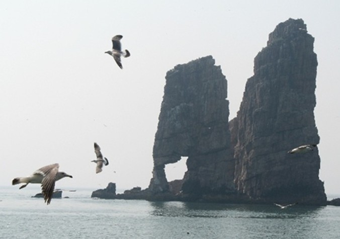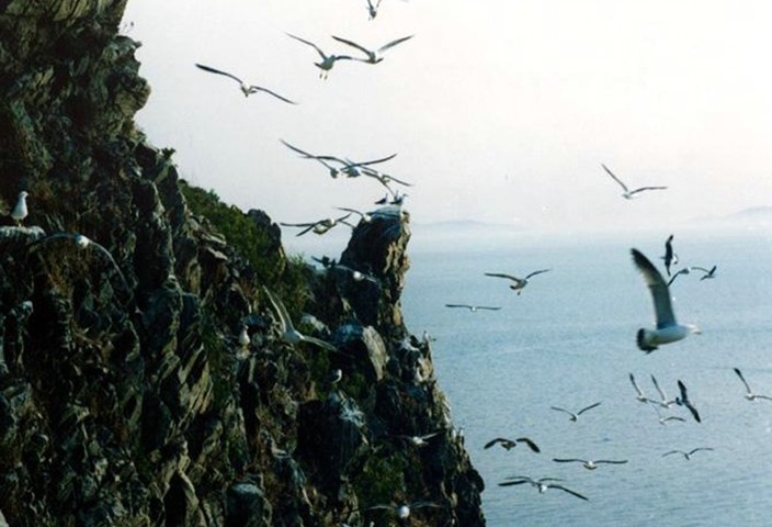 萬鳥島坐落于長島諸島中部偏東,這個海拔73.5米、僅有0.05平方公里的小島,在浩渺的汪洋大海之中,簡直是一粒微不足道的沙粒,然而海深魅力大,島小情趣多,因島上棲居著幾萬只黑尾鷗、海鸕鶿、白腰雨燕等海鳥,后稱萬鳥島。海岸地貌懸崖陡壁占90%以上,斷崖系石英巖與板巖互層,節(jié)理發(fā)育,破碎性強(qiáng),經(jīng)千百年風(fēng)化和海蝕,崖壁此凸彼凹,石階、石臺、石窟、石穴鱗次櫛比,形成一座自然的“海鷗石樓”。每年四、五月間,成千上萬只海鷗在此安家,覓食、嬉戲、休憩、生兒育女。這時的小島變成了喧囂的鳥國、沸騰的劇場、海鷗的天堂。