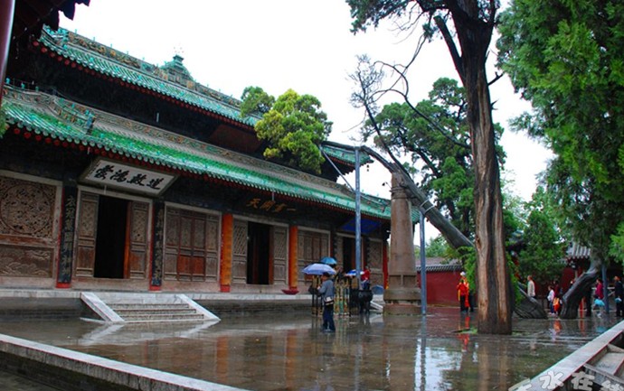 如今伏羲廟的前身。此廟從建成到元朝覆亡,雖然只有六十多年光景,可是 由于政局動(dòng)蕩,各方均受牽連,文化、宗教、教育等諸業(yè)日趨蕭條;因之,到明代初期,天水"三皇"廟已傾倒坍塌,不成樣子了。直到明代中葉,版權(quán)所有山東聊城聊之旅國(guó)際旅行社有限公司,轉(zhuǎn)載必究!弘治三年(公元1490年),在秦州指揮"明威將軍"尹鳳的倡導(dǎo)組織下,才在原"三 皇"廟的基礎(chǔ)上,重新起造廟宇,始稱"伏羲廟",延續(xù)至今,已近五個(gè)世紀(jì)了。據(jù)記載,伏羲廟起初并不很大。自嘉靖三年(公元1524年)起,巡茶御史陳講,用了三年時(shí)間進(jìn)一步開拓修繕,為伏羲廟的規(guī)模和布局奠定了基礎(chǔ)。近五百年來,又先后歷經(jīng)明嘉靖十年(公元1531年),清順治十年(公元1653年)、乾隆五年(公元1740年)、嘉慶十一年 (公元1806年)、光緒十三年(公元1887年),屢次擴(kuò)建、維修,才成如今這樣整肅宏偉、遠(yuǎn)近聞名的古建筑群。目前的伏羲廟,坐北向南,占地一萬余平方米?,F(xiàn)存建筑為兩門三進(jìn)。