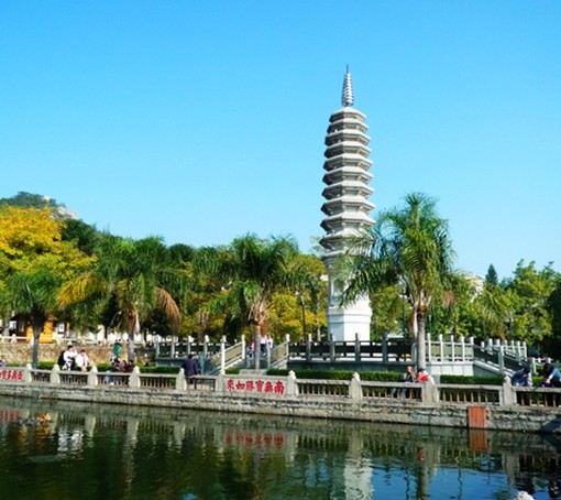 南普陀寺里有七座白玉如來(lái)佛塔和二座11層高的萬(wàn)壽塔,那是1993年,1994年由信士捐建是萬(wàn)壽塔前有個(gè)蓮花池,夏日荷花盛開(kāi)時(shí),藍(lán)天,白塔,綠葉,花海,展示這里是分外清靜高潔的佛門(mén)凈地。