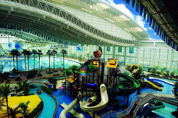 建筑面積約20000㎡,點式玻璃幕墻裝飾外墻,南向遮陽百頁可調(diào)角度,以控制陽光的射入量;跨度達(dá)70M的可開啟屋頂別具一格。"水空間"項目在亞洲目前是比較先進(jìn)的以水為主題的水上娛樂場館,它可以同時容納5000人在館內(nèi)進(jìn)行娛樂消費。場內(nèi)設(shè)有標(biāo)準(zhǔn)國際比賽游泳池、人工造浪達(dá)216種、滑板沖浪、室內(nèi)太空盆、競技速滑、漂流河道、生態(tài)沙灘、兒童戲水池、家庭互動區(qū)及餐飲區(qū)、半地下水景,咖啡屋,商品部、休閑區(qū)、貴賓間、仿生綠植等。更值得一提的是漂流河有室內(nèi)和室外部分,夏季互相連通,加上室外泳池和12個溫泉泡池,室內(nèi)外相互交融自然和諧。另外,構(gòu)思新穎的水中升降舞臺還可舉辦富有民族特色的歌舞晚會、水上婚禮、服裝展示等大型活動。