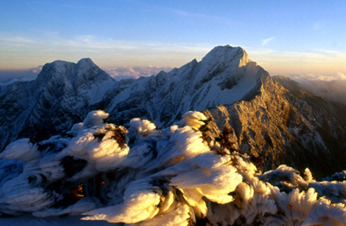 主峰玉山海拔3997米,為臺灣第一高峰。因常年積雪,遠望如玉,南、西、北四座高峰,人稱“五岳朝天”。玉山之美,美在它的奇峰。主峰挺拔、高峻,山容山勢具王者之尊。站在山巔向四周眺望;北面雪山、南湖大山、中央尖山;南面關山、北大武山,遍覽無遺;清晰可數(shù)。真有“會當凌絕頂,一覽眾山小”之感,俯視全省,群山如丘,河溪如帶;遠望太平洋,回顧臺灣海峽,只見無窮蔚藍空碧,仿佛天地相接,直覺浩氣充溢心胸。