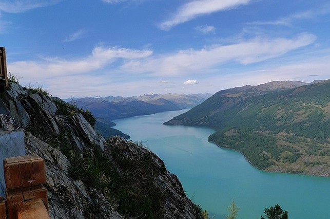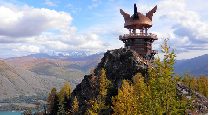 觀魚亭建于海拔2030米的哈拉開特(蒙古語意為駱駝峰)山頂上,與湖面的垂直落差達600多米,因處于觀察“湖怪”的最佳位置,故得名觀魚亭。去觀魚亭有兩條路可供選擇:一條是乘汽車從山后繞行到山腰;另一條是從湖出水口山前專為爬山者鋪設的石階盤旋步行而上。登上湖西邊山頂?shù)?ldquo;觀魚亭”,可觀看喀納斯湖的整體美景。其一可鳥瞰喀納斯湖,四分之三的湖面盡收眼底。湖面呈綢緞般光滑平靜,宛如一塊色彩斑駁的翡翠鑲嵌在山谷之間,并向下游河谷蜿蜒流淌,波光閃耀,飄散著童話般的色彩。順河水之勢望去依稀可見神仙灣、臥龍灣等河曲,草色木色水色在逆光下不斷變幻,充滿了鮮活的靈性,體現(xiàn)出細膩、幽雅的南國秀色般的美麗;其二可觀覽湖周層巒疊嶂、翠峰倒影、云起波濤的秀麗山色;其三舉目北望,從南向北蜿蜒而上的喀納斯湖水被群山阻擋,山巒之中可清楚地看到阿爾泰山的最高峰——友誼峰(4374米),山頂雄偉壯麗的冰雪世界,猶如一塊光潔晶瑩的白玉,聳立于群峰之巔。而 “U” 谷、古冰斗、冰磧壟等古冰川地貌遺跡,分布在喀納斯湖兩側的高山和河谷內(nèi),證明湖區(qū)曾有過多期冰川活動。