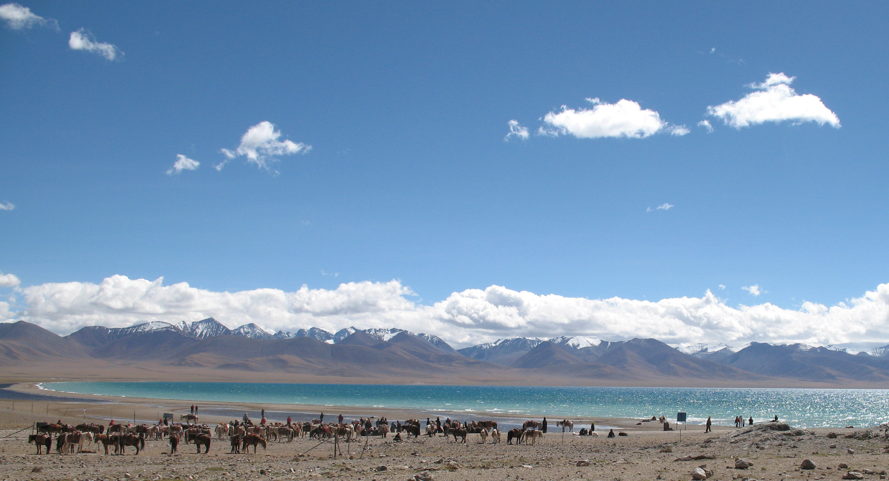 途中休息2次。10:00,在海拔4630米的念青唐古拉山觀景臺(tái)休息一會(huì),車(chē)停在公路邊。 11:30,在那根拉山口休息。這里海拔5190米,是拉薩到納木措的最高點(diǎn)。但要特別注意,這里有一些當(dāng)?shù)厝藸恐笈J召M(fèi)照相,非常惡劣!不給錢(qián)就擋住那根拉的石碑,不讓人照相?;蛘呷浩鸸粲慰汀S慰驮谶@里停留的時(shí)間有限,根本沒(méi)辦法和他們耗。最好不要和他們糾纏,能照就趕快照相。如果發(fā)生沖突,荒山野嶺,不好收拾。納木措也有一些牽馬或牦牛收費(fèi)照相的。