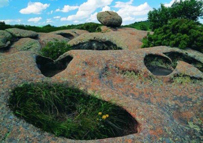 青山園區(qū)位于克什克騰地質(zhì)公園東部,包括關(guān)東車(chē)景區(qū)和青山景區(qū),面積37.13km。形成于1億多年前的花崗巖在風(fēng)蝕、重力等外力的長(zhǎng)期作用下形成了關(guān)東車(chē)景區(qū)內(nèi)形態(tài)各異的峰林地貌,如蒼鷹、似巨龍,惟妙惟肖,神采奕奕。而在青山景區(qū)面積約1000m平緩起伏的花崗巖石面上,分布著200多個(gè)呈橢圓形、圓形或不規(guī)則半圓形的巖臼,被稱作“九缸十八鍋”。它們形狀如臼如缸、如碗如匙、如鼓如盤(pán)、如杯如桶,全面展現(xiàn)了巖臼的不同發(fā)育階段,是至今為止世界上規(guī)模最大、保存最好、類型最全的巖臼群。