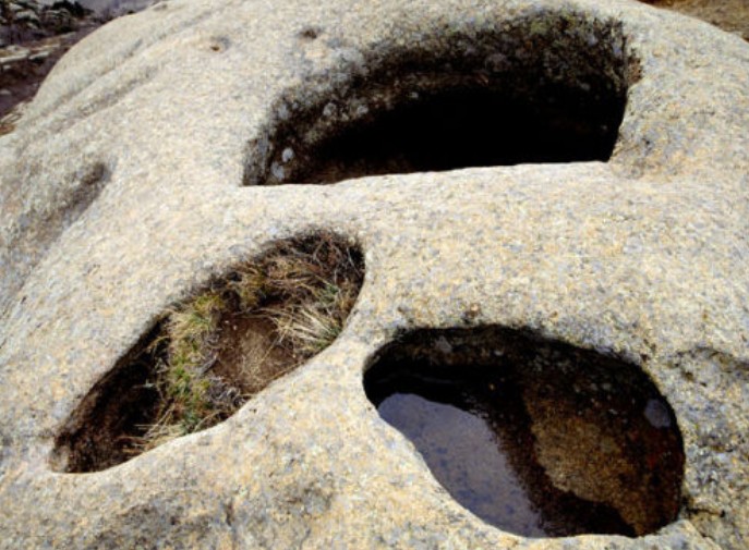 青山自然保護(hù)區(qū)位于海拔1574米的青山山體上,在山頂頂峰分布著各種各樣的冰臼,其平面上多數(shù)呈圓形、近圓形、橢圓形和不規(guī)則的形狀。有的象葫蘆,有的象梅花,有的象瓜子。一般冰臼口稍小,中下部較大,底多較平或呈鍋底微凹。形體“似臼”、“似盤”、“似盆”、“似匙”等,可以說應(yīng)有盡有。其中較深的冰臼多呈口小、肚大和底平特征??诓可暇墡в腥笨冢ɑ蜷_口),缺口有大有小,有深有淺。一般臼口寬約0.3~2米,深0.1~2米左右。最大的直徑達(dá)10.5米,深4.5米;最小的只有幾公分,似一般鈕扣大小。據(jù)調(diào)查統(tǒng)計(jì),在方圓不到2平方公里的范圍內(nèi),就有大小不一的冰臼1000多個(gè)。有的冰臼光潔如洗,無任何殘留物和充填物,但很多冰臼中,都填滿風(fēng)塵黃土物質(zhì),已長滿花、草或喬木、灌木,形成大小不同的“天然盆景”,置于堅(jiān)硬平坦的花崗巖山脊上,十分壯觀,給人極大的神奇感和奧秘感。