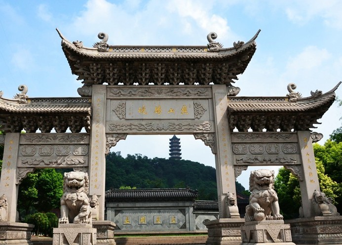 從長江邊上與焦山對峙的象山腳下的渡口擺渡過江,不到五分鐘就可踏上綠色的小島—焦山。迎面的焦山大門,朱漆彩畫,一對石獅鎮(zhèn)守大門。門旁左右懸掛著清代光緒年間巴州廖倫所寫的一幅楹聯(lián)“長江此天塹,中國有圣人”,顯得古樸典雅。進(jìn)入山門,迎壁就是對聯(lián)的橫披“海不揚(yáng)波”四個(gè)大字,為明代書法家胡纘宗所書,意為焦山矗立江心,猶如鎮(zhèn)海之石,驅(qū)逐水妖,故而海不揚(yáng)波。在佛教上“海不揚(yáng)波”是清平世界的意思。