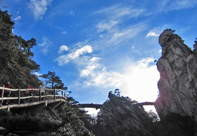 天堂寨頂峰天堂頂,海拔1729、13米,素有中原第一峰之美稱。這里,北望中原,南眺荊楚,巍巍群山盡收眼底,茫茫天地網(wǎng)絡(luò)其中,氣勢磅礴,景色壯觀。環(huán)顧四周,筆架山雄姿若隱若現(xiàn),九資河倩景如玉帶飄舞。清風吹過,足下林海頓時泛起層層綠波,起伏跌宕,似有排山倒海之勢,響起陣陣濤聲,久久回蕩,如鼓角相聞。這里還是觀高山日出的理想佳地。晨曦初露,天宇朦朧,一輪紅日噴薄而出,霎時萬道霞光籠罩四周,萬物復蘇,百鳥齊鳴,好一幅高山日出的壯麗畫面。