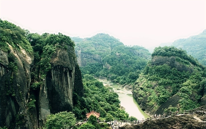 曲折縈回的九曲溪貫穿于丹崖群峰之間,如玉帶串珍珠,將36峰、99巖連為一體。山臨水而立,水繞山而行,峰巖高低、河床寬窄、曲率大小、水流急緩、視域大小、視角仰俯等都達到絕妙的程度,構成“一溪貫群山,兩巖列仙岫”的獨特美景,溪光山色中溶注了中國傳統(tǒng)的詩情畫意和美學意境。登山可覽碧水清溪,涉水能看奇峰異石,乘一葉古樸竹筏順溪而下,可賞奇拔秀偉、千姿百態(tài)、爭奇斗妍的形象美;可品泉歌鳥鳴、浪擊輕舟、篙點褐石、綠樹紅花的色彩美;可看流水游魚、浮云飛鳥、艄公游人的動態(tài)美;可睹云繞山嶂、霧鎖峰腰、雨罩群峰的朦朧美,身臨秀色美景,猶如漫步奇幻百出的山水畫廊,聆聽豐富有變奏的交響樂章,欣賞韻味獨特的瑤池歌舞,品味韻律有致的美麗詩篇,如癡如醉,飄飄欲仙。這是武夷山自然景觀的精華,堪稱世界一絕。