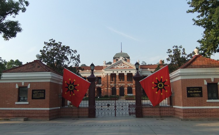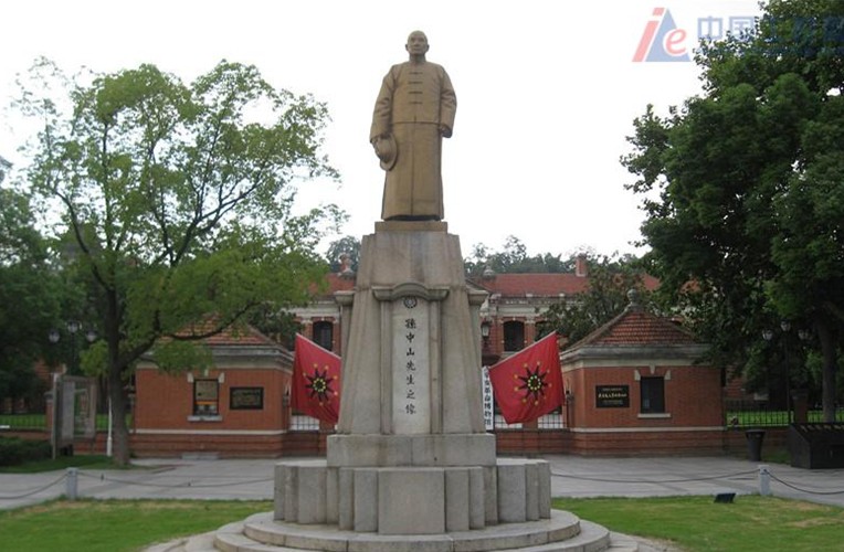 大樓后方也是一座二層樓房。兩側(cè)各有一排紅色平房。正前方出口處裝有鐵柵大門,大門兩側(cè)為門房,由上半部裝有鐵柵的紅色矮墻自門房兩側(cè)平伸,與左右平房連接,圍成方形院落。舊址面對閱馬場,院門外正前方立有孫中山銅像,儀表莊嚴(yán)安詳。