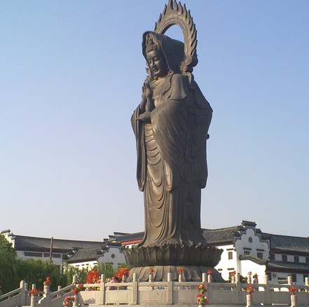 重修。大殿正中供奉著釋迦牟尼坐像,兩側(cè)為其弟子阿難和迦葉像。釋迦偏袒左肩,結(jié)跏趺坐,莊嚴(yán)靜穆。佛像后背是用樟木雕刻而成的“五龍捧圣”的圖案。佛像前還有韋馱、彌勒、地藏像。佛像后是一組海島觀音像。只見海島觀音赤足站立,左右侍立著一龍女和童子,背后是一面高達(dá)八尺的泥塑懸崖峭壁,版權(quán)所有山東聊城聊之旅國際旅行社有限公司,轉(zhuǎn)載必究! 足下碧波萬頃,怒濤洶涌。整個(gè)塑像向前傾覆。人們仰視上去,只見觀音衣袖似在飄動(dòng),正在洶涌的波濤上迎面向你走來,增加了宗教藝術(shù)的感染力。佛像前的供桌,是一件不可多得的木刻珍品。供桌高4丈8尺,橫闊1丈2尺,深寬2.5尺,前嵌垂欄,寬1.5尺,高0.6尺,其間分為五格,深畫鏤空。圖案描繪的是唐玄奘取經(jīng)回長安時(shí),君民夾道歡迎的場(chǎng)面:有唐僧、孫悟空、豬八戒、沙和尚等《西游記》人物,有李世民以下文武百官、侍衛(wèi)、庶民百姓;有亭院殿墻,車馬山水,幢幡寶蓋,香爐蠟臺(tái)等一應(yīng)俱全。綜觀全圖,繁復(fù)活潑,盛況空前。垂欄下沿為五龍?jiān)撇剩車牙@,以四虎腿支地,生動(dòng)有力。相傳這一樟木雕刻由十人歷時(shí)一年才完成。