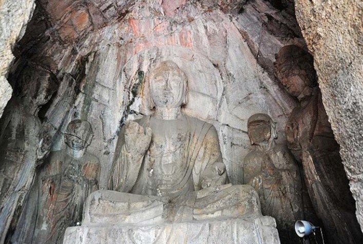 潛溪寺又名齋祓堂是龍門西山北端的第一個大洞。唐高宗年間(650-683)鑿造,相傳曾是宰相李藩的別墅,清代原建木結(jié)構(gòu)窟檐。1990年改建為仿唐木結(jié)構(gòu)樣式,鋪石板地面。