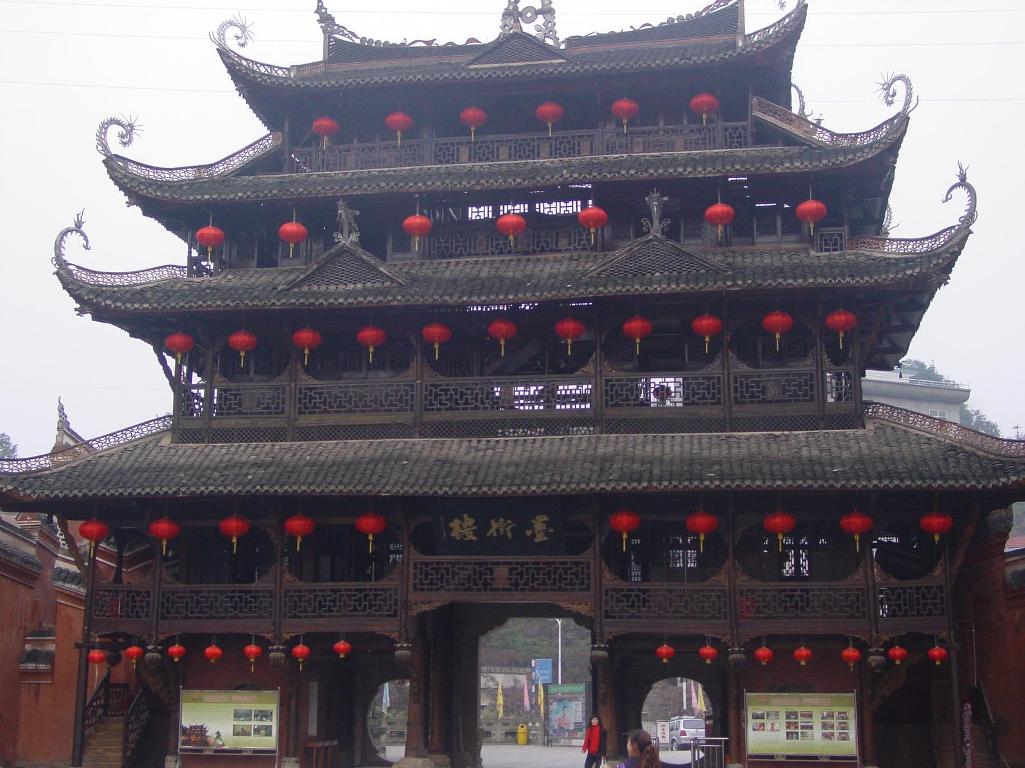土司城門樓高25米,寬12米,是棟純粹榫卯結(jié)構(gòu)的木樓。高大壯觀、結(jié)構(gòu)精良;布局精巧合理。兩邊走馬轉(zhuǎn)角樓梯可盤旋至頂,層層相通相連。門樓門窗由200扇門,189塊鏤空雕花圖案組成,內(nèi)容多為戲文及民間傳奇故事。有趣的是,整座門樓還隱含著許多奇巧而又寓意雙關(guān)的數(shù)字,如門樓高4層、12根柱、24根梁。那意味著什么呢?意味著一年中的4季、12個月和24個節(jié)氣。還有門樓屋頂上數(shù)只蝙蝠拱托著一枚古錢的裝飾雕塑,它叫"福在眼前"。福就是借指蝙蝠,錢就是那枚銅錢了。真算是無字勝似有字,于無聲處說吉祥了。