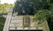 由梅福庵西行不遠(yuǎn)處便可看到磐陀石。磐陀石由上下兩石相累而成,下面一塊巨石底闊上尖,周廣20余米,中間凸出處將上石托住,曰磐;上面一塊巨石上平底尖,高達(dá)3米,寬近7米,呈菱形,曰陀。上下兩石接縫處間隙如線,睨之通明,似接未接,好似一石空懸于一石之上。
