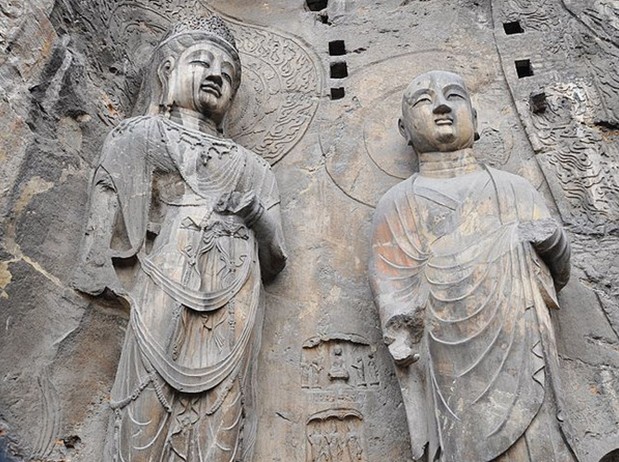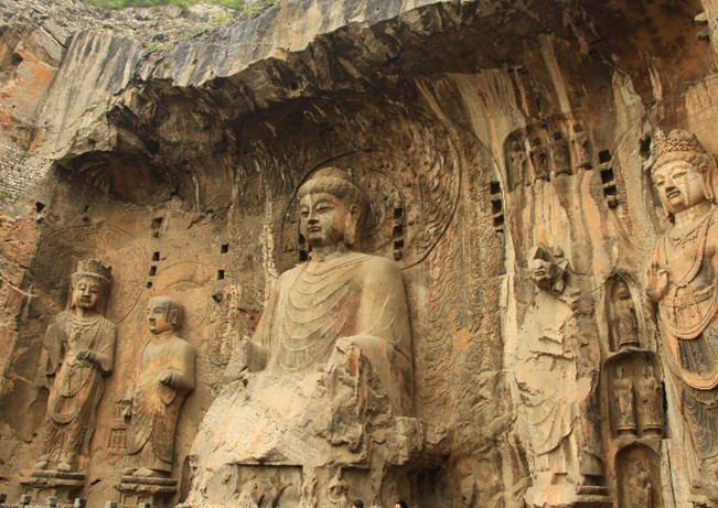 奉先寺是龍門石窟中規(guī)模最大、最具有代表性的露天佛龕,形態(tài)各異、刻畫傳神的造像顯示了盛唐雕塑藝術(shù)的高度成就,成為石雕藝術(shù)史上的奇觀。