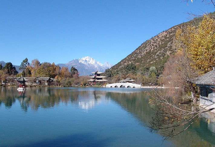 云南麗江黑龍?zhí)叮蝴惤邶執(zhí)队置袢珗@,位于城北象山腳下,從古城四方街沿經(jīng)緯縱橫的玉河溯流而上,約行一公里有一處晶瑩清澈的泉潭,即為中外聞名的黑龍?zhí)?。潭水從石縫間涌涌噴出,依山斛清泉匯成四萬平方米潭面。四周山清水秀,柳暗花明。依山傍水造型優(yōu)美的古建筑點(diǎn)綴其間。其流韻溢彩,常引人駐足留連。