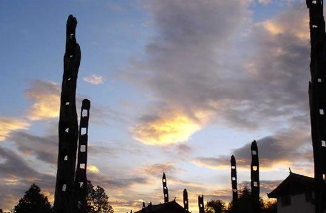 出大研城北走,眼前是一片綿延遼闊的原野,一叢叢樹(shù)前,掩映著一個(gè)古老的村舍,納西族先民跨過(guò)金沙江,從大雪山南下進(jìn)入麗江壩子,就是在曠野上創(chuàng)建了他們?cè)缙诘奈拿鳌?/p>