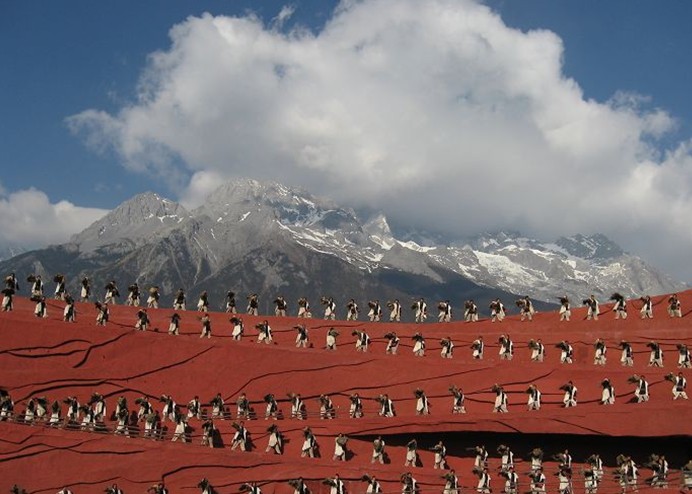 《印象麗江》導(dǎo)演張藝謀:“這里有一個(gè)世界上最大的一次幕間休息,但觀(guān)眾并沒(méi)有離開(kāi)演出所營(yíng)造的情境。你可以去河邊小坐、品茗小酌,還可以去討價(jià)還價(jià)、拍照留影,但不論你做什么,你已經(jīng)在和納西人民的交往之中。”