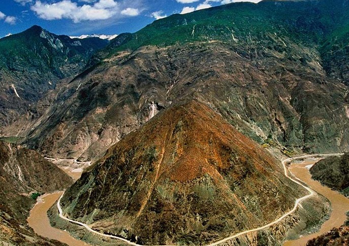 金沙江由北東去,匯集雅壟江、大渡河、嘉陵江,于是中國便有了長江。瀾滄江由北南下緩緩而流,穿越國界便成了鄰國湄公河的上游。怒江山北南下奔騰急湍闖進緬甸便成了薩爾溫江的上游。三江同發(fā)源于青藏高原,三江攜手并肩在云南崇山峻嶺中奔流。而金沙江經(jīng)石鼓鎮(zhèn)天造奇觀(長江第一灣)急轉(zhuǎn)回頭大江東去最終流入太平洋……而瀾滄江、怒江穿流緬甸、越南、老撾、泰國最終流入印度洋……