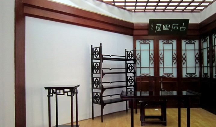 白石先生的畫室里陳列著白石大師曾用過的畫案即兩頭沉的硬雜木寫字臺(tái)(長約1.4米,寬0.7米),案上擺有白石先生用過的毛筆、古硯、筆洗、平底小勺、刻刀、筆筒及蟋蟀斗等。墻上掛一幅白石作品水蓼草蟲。北面擺放硬木雕花大立柜,(高2米×1.2),西邊擺一個(gè)比那個(gè)小些的小立柜。門外掛一竹簾,看起來畫室極其簡樸。再看齊白石先生創(chuàng)作成百上千萬元的精品力作,用過的毛筆也并不出奇,畫案筆架上擺放著三只毛筆,一只是純羊毫大門斗,兩只中楷兼毫筆,筆桿都是普通竹桿,案頭右邊還放著一只更大一些關(guān)毫筆,都很普通,看來當(dāng)時(shí)做畫的條件太差了,如果有現(xiàn)在這個(gè)條件和環(huán)境,白石大師創(chuàng)作的精品還要多的多。