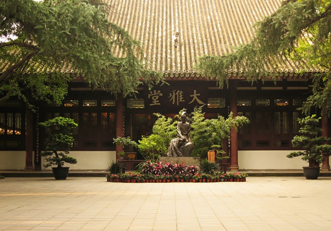 今日草堂,古樸典雅,規(guī)模宏偉,占地300多畝。其中大廨、詩史堂、工部祠3座主要紀念性建筑物,坐落在中軸線上,幽深寧靜。廨堂之間,回廊環(huán)繞,別有情趣。祠前東穿花徑,西憑水檻,祠后點綴亭、臺、池、榭,又是一番風光。園內(nèi)有蔽日遮天的香楠林、傲霜迎春的梅苑、清香四溢的蘭園、茂密如云的翠竹蒼松。整座祠宇即有詩情,又富畫意,是人文景觀和自然景觀相結合的著名園林。