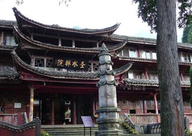 峨眉山圣水禪院原名神水庵、神水閣,有五重殿宇,全寺的殿堂和附屬房屋全系木制結構。禪院原為明代安慶巡撫吳用先的舊居,因周圍“修竹萬竿”,有“水竹色相繞,碧花動軒楹”(唐,孟郊 《旅次洛城東水亭》)的意境,取名“水竹居”。明萬歷末年(約公元1619年),因水竹居前有“玉液”神水,遂改宅為寺,名“神水庵”。寺院前有一塔,傳為隋代智者大師衣缽塔。