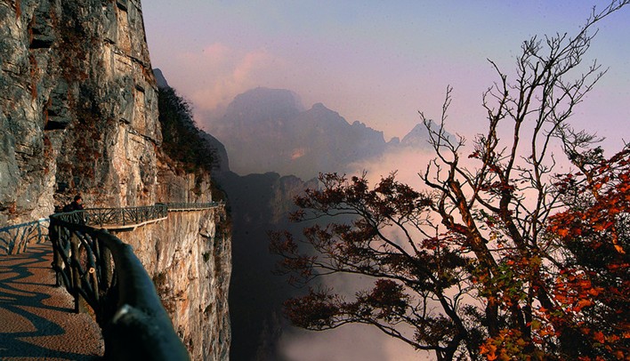 玻璃棧道是2011年9月份完工的一個(gè)貼山懸空玻璃過(guò)道。位于天門山鬼谷棧道起始位置500米處,這里是一個(gè)岔路口,對(duì)于喜歡刺激點(diǎn)的,可以選擇這樣走過(guò),反之可以繞旁邊的石道而過(guò)。它采用堅(jiān)硬的鋼化玻璃,周圍有金屬欄桿,腳下就是透明的玻璃,與峽谷底部的相對(duì)高度是近400米。從上面走過(guò),能煉膽。膽小者勿去