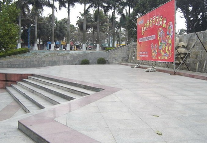 靠近北部灣中路的文化廣場(chǎng)區(qū)由林蔭廣場(chǎng)、露天表演廣場(chǎng)和展覽館三部分構(gòu)成。林蔭廣場(chǎng)綠化選擇具有南方特色闊葉喬木水石榕為主要樹種,這種樹根據(jù)長(zhǎng)勢(shì)可以修剪成方體或珠體形狀,形成規(guī)矩,整齊的廣場(chǎng)綠色景觀,樹下設(shè)置有簡(jiǎn)潔大方,別具熱帶風(fēng)情的“C”形木椅,同時(shí)還設(shè)計(jì)有造型活潑的閱報(bào)欄,露天表演廣場(chǎng)是利用原有地形建成的開敞式的公共文化娛樂和休息場(chǎng)所,面積約2000平方米,依就原地形建有長(zhǎng)形的水幕墻、巨型浮雕“海之韻”、露天表演舞臺(tái)、音樂茶座、階梯級(jí)觀眾看臺(tái)、騎樓式店鋪、斜坡式花壇、殘疾人斜坡道等園林設(shè)施,創(chuàng)造了一個(gè)優(yōu)雅宜人、景觀獨(dú)特的室外環(huán)境;展覽館是利用原水廠蓄水池改造而成的頂面為球殼形的一座造型十分獨(dú)特的建筑,占地約500平方米,屬無(wú)梁磚拱結(jié)構(gòu),既保留了歷史建筑工藝,又可作為公共展覽館,豐富了廣場(chǎng)的文化內(nèi)容。