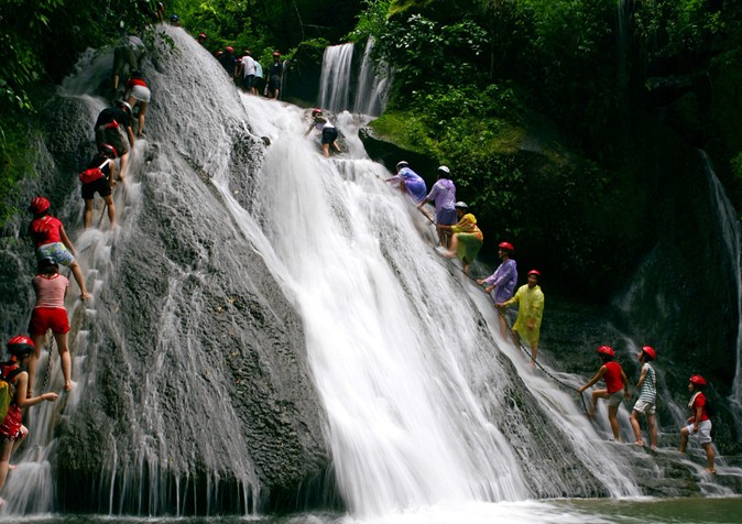 登瀑布是勇敢的活動(dòng)雖然沒(méi)有大的危險(xiǎn),但是要游客出體力,跟在別人往往是水濺一身,下水急攀登較難,雙腳輪流向上攀登,后面有人催游客,越是想往上爬,越是走不起來(lái),手抓鐵鏈在空中搖擺著;偶爾后邊的人會(huì)幫上面的人扶一下腳,共同協(xié)作攀登困難者,也是團(tuán)結(jié)協(xié)作的團(tuán)隊(duì)精神;沿小溪而上,水有深有淺,第二道瀑布明顯比第一道要小得多,故快速而過(guò),