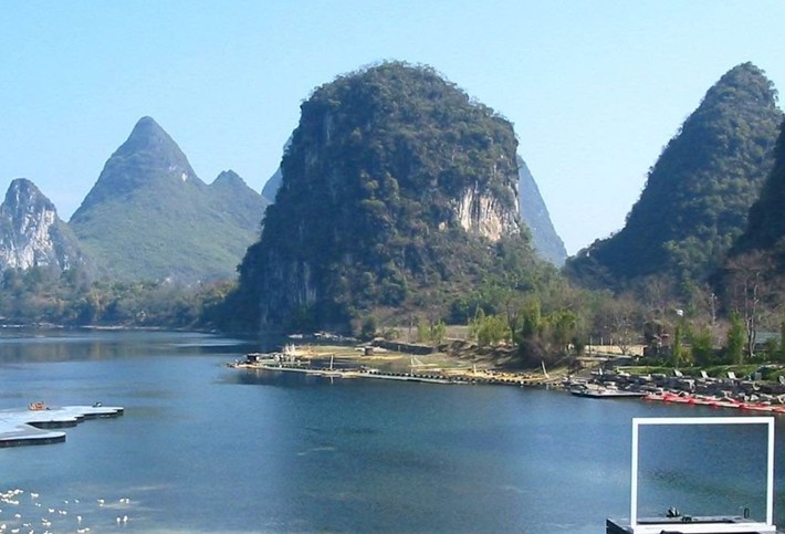 蓮峰下一貨運碼頭,叫“富安碼頭”,曾是航運業(yè)務繁忙之地,碼頭沒有臺階,上下自然形成坡度。這里便是電影《劉三姐》“對歌”的經(jīng)典場景,昔時河汊里置一豪華木船實景,莫老爺和陶、李、羅三個秀才立于船頭與劉三姐“對歌”,被三姐及眾人痛快淋漓一頓臭罵,莫老爺氣急敗壞而落水一戲,便在此拍成。