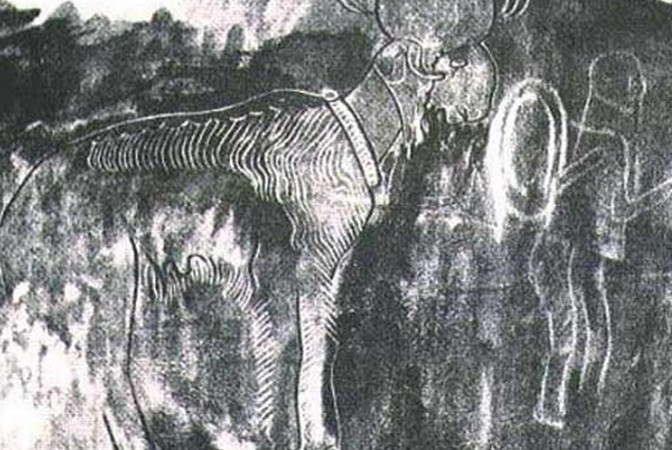 在盧山巖畫中,形象最多最集中的為一號(hào)巖畫,巖面面積約20米見方,其上有150多個(gè)形象。使人們頗感興趣的是車獵和生殖圖。車獵為雙轅位馬,人立車上,引弓如月。箭射向車后的野牛。為了形象地表達(dá)射獵的意圖,制作者將箭矢飛行的弧線也打鑿出來。這幅圖打制精細(xì),形象準(zhǔn)確。畫面雖然有些漫漶不清,但其繪制意圖卻依然可以看得清楚。畫面一男一女。女的正面,雙腿微曲向兩邊分開。在兩腿之間、臀部下面,打鑿出一直徑約3厘米的圓點(diǎn),以象征女性生殖器;男的在女的左面,從側(cè)面繪制,生殖器很突出。緊接著男女圖的下面,有一條打制得很規(guī)范的曲線,兩邊分布有許多圓點(diǎn)。由于對(duì)男女生殖器的強(qiáng)調(diào),故其交媾場面不易直接表現(xiàn),而采用象征性的符號(hào)(圓代表女性,曲線代表男性)的集合來表示。這種用符號(hào)來表現(xiàn)交媾的思維方式,在中國其它地方如內(nèi)蒙陰山也有發(fā)現(xiàn),即巖畫界所謂的“蹄印”或“漥穴”。這幅畫的意義在于使人們對(duì)吐蕃的某些文化觀念和觀念的表達(dá)方式有所了解。這里的交媾,無疑帶有刺激牲畜生產(chǎn)的巫術(shù)意義;而符號(hào)象征的表現(xiàn)方式,則使我們對(duì)如何理解所有巖畫形象有所啟示。如牛的制作者想表達(dá)的未必是牛的本身。或許借牛的形象來表達(dá)牛之外的抽象概念。人們?cè)谶@幅畫中已經(jīng)看到,制作者借“有形”的交媾,來表達(dá)“無形”的生殖概念。
