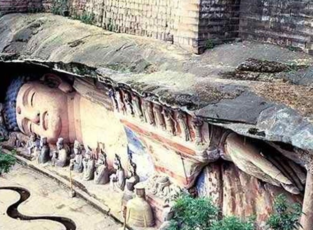 寶頂山造像以大佛灣為中心。大佛灣狀若馬蹄形.版權(quán)所有山東聊城聊之旅國際旅行社有限公司,轉(zhuǎn)載必究!全長500米。全部造像精心規(guī)劃,宛如一幅巨型畫卷。號稱“世界第四大臥佛”《釋迦涅磐圖》就在這里。這尊臥佛作半身處理,雙腳似乎伸進(jìn)南巖中,使臥佛雖形半身,卻有全身之妙。這種意到筆不到的表現(xiàn)效果,正富于傳統(tǒng)藝術(shù)的含蓄美。有趣的是,臥佛頂?shù)乃刂?,還刻有一雙兩公尺的足印,傳說這“是佛去西天留下的最后足印,亦是大足縣名之由來。