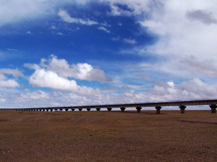 萬丈鹽橋道寬路長,風(fēng)光無限。人們乘車來到這里,只見筆直坦蕩的路橋,象一把利劍將浩瀚的鹽湖一劈兩半。鹽橋兩旁有鉀肥廠的廠房,宿舍,有溝壑一般的采礦點,不遠(yuǎn)處還有舉世聞名的青藏鐵路,一列列長蛇似的火車,吞云吐霧,鳴鳴吼叫著從湖面上飛馳而過。