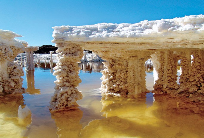驅(qū)車行進一段之后,司機師傅突然將車停下說:“萬丈鹽橋到了。”筆者一行急忙跳下車去,爭睹這遠近聞名的人間奇觀。可乍看之下,鹽橋不過是一條普通的公路而已,和想象中的樣子相去甚遠。經(jīng)介紹才知道,其實這條路是懸浮的,全由鹽晶筑成在湖面上,足有幾米厚,并與周圍自然結(jié)成的鹽蓋連成一體,像是在平常的陸地上。鹽橋全長32公里,折合市制可達萬丈,因此而得名。有意思的是,路面的維修方法十分獨特,如果發(fā)現(xiàn)哪里有坑坑洼洼,只需從路邊鏟一點鹽來填平,再灑一點鹵水就平整如初了。