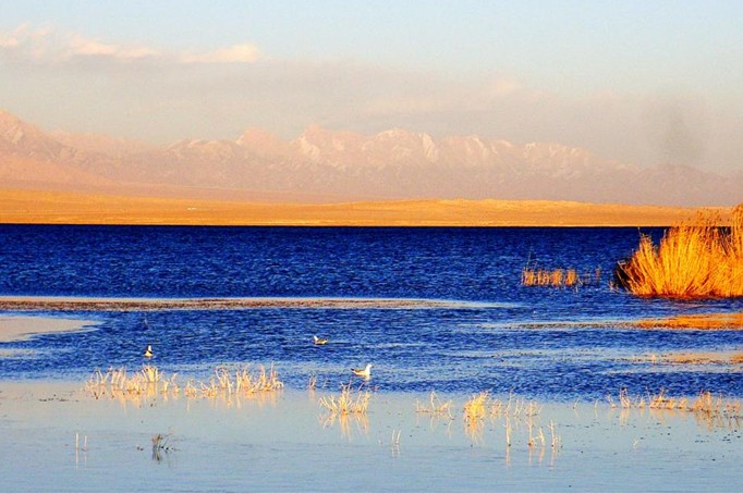 可魯克湖在柴達(dá)木盆地的東北部,距海西蒙古族藏族自治州首府德令哈約50公里的懷頭他拉草原上,有兩個(gè)一大一小、美麗恬靜的湖泊,名叫可魯克湖和托素湖。它們就象是兩面熠熠閃亮的巨大寶鏡,鑲嵌在浩瀚的戈壁、茫茫的草原之間。