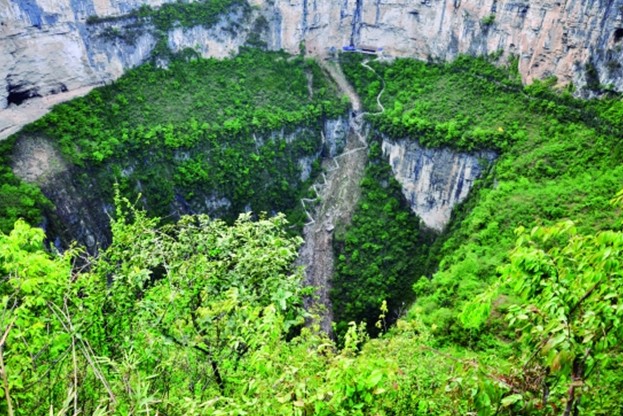 從坑口到坑底有一條蜿蜒曲折的梯道,總長度2.7公里(2800余步臺階)地縫是兩座平行山巒間凹下去呈“V”字形的一條大裂縫, 它發(fā)源于奉節(jié)縣長安鄉(xiāng)火燒二壩,全長37公里。地縫上段地勢開闊,林木繁茂,小橋流水;版權(quán)所有山東聊城聊之旅國際旅行社有限公司,轉(zhuǎn)載必究!中段逼仄如巷,寬處達70米左右,最窄處僅容一人通行,最深處達900米,溪水自“黑眼”一帶注入地下暗河,形成干谷;下段是地下峽谷,中外探險家曾多次深入地縫中探險,專家推測地縫暗河流向了小寨天坑?!?/p>