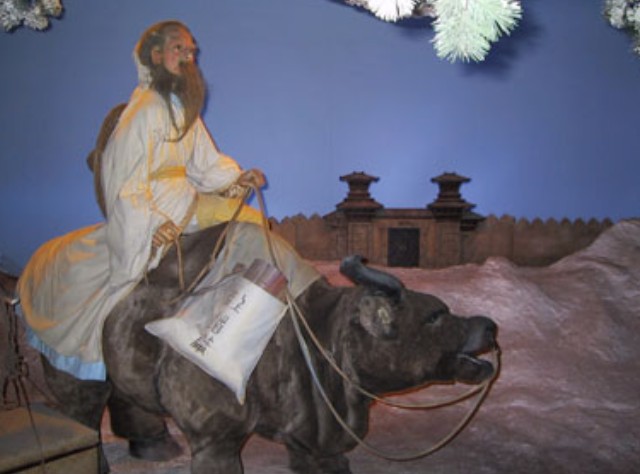 來到我國著名思想家,道德學(xué)派創(chuàng)始人,安徽渦陽人的老子展位,只見騎在青牛背上的老子,白發(fā)蒼蒼,目光炯炯有神,正緩緩向前走來,他身旁是挑著行囊的書童。隨著呼嘯的風(fēng)聲,天空飄起了鵝毛大雪,轉(zhuǎn)眼間便白茫茫一片,眼前“秦界”,函谷關(guān)依稀可見。老子手中握著的牛繩一起一落,青牛不斷發(fā)出“哞哞”的叫聲,正向函谷關(guān)進(jìn)發(fā),準(zhǔn)備西去流沙。由于展區(qū)內(nèi)的人物、景物采用了光電技術(shù),人物與場(chǎng)景均十分逼真。