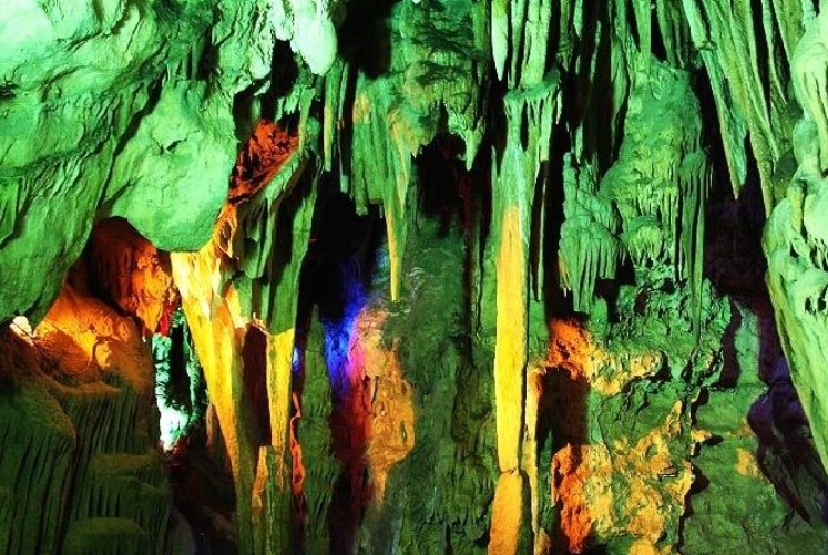 進(jìn)入洞中,人的心情驟然緊張而又企盼著什么,難以名狀。只見在彩燈的折射下,奇石林立,五光十色,令人眼花繚亂,大有美不勝收之感。什么天宮、龍宮、玉免宮……