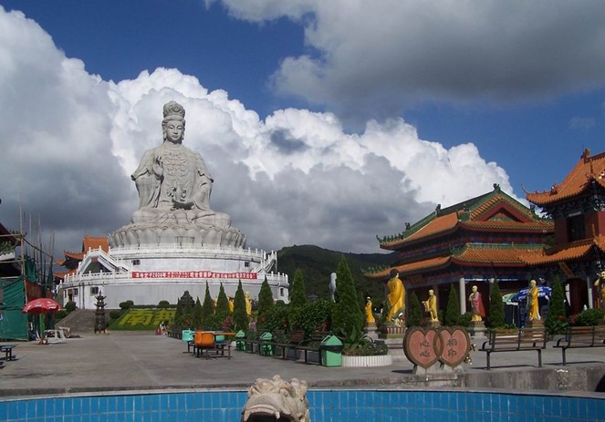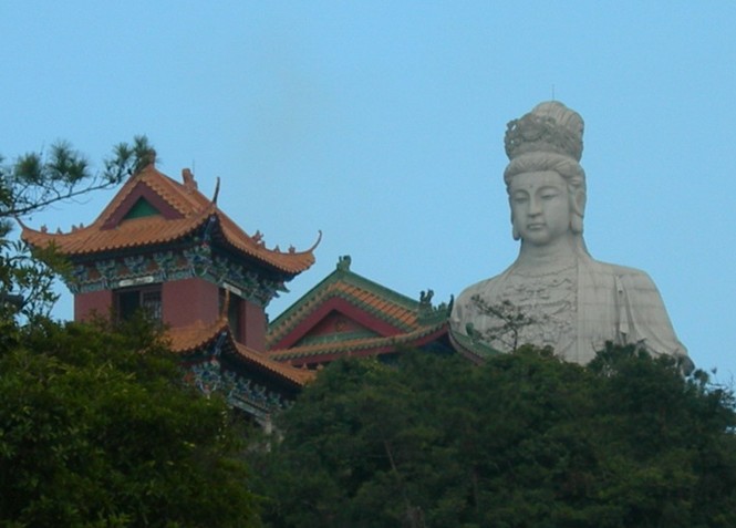 觀音廣場位于488米的觀音山頂,占地面積10000平方米,視野開闊,花繁葉茂,空氣清新,四季宜人。觀音菩薩圣像,就是目前全國乃至全世界最大的花崗巖觀音菩薩雕像。這尊觀音菩薩的圣像主題高33米,橫截面寬10.2米,體積有630立方米,總重3300噸,是由999塊0.5至8噸不等的福建蒲田優(yōu)質(zhì)花崗巖拼裝而成。圣像由國家一級雕塑師陳寶如設(shè)計,全部采用人工雕鑿,從1997年9月動工,至2001年6月竣工,歷時四年,總工日達(dá)98600個。