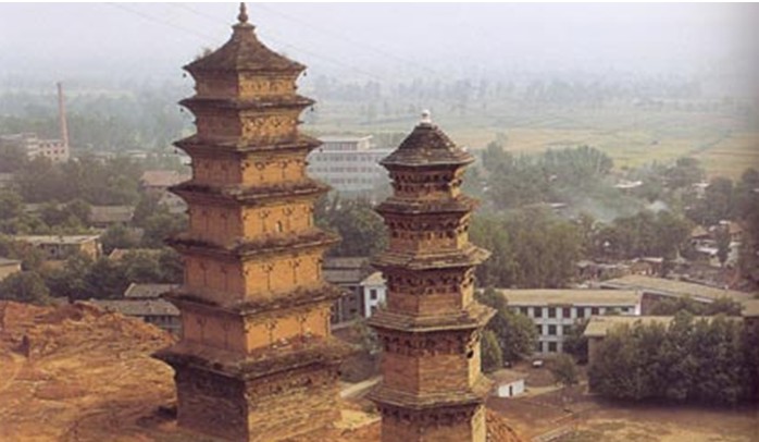 華嚴(yán)寺是中國(guó)佛教華嚴(yán)宗的祖庭。華嚴(yán)寺由初建到以后數(shù)百年間,無(wú)高大殿堂建筑的記載,而只記有鑿原為窟,以安置佛像及僧眾居住,華嚴(yán)寺可以說(shuō)是黃土高原上一座典型的窟洞寺院。從塔的記載看,這里曾有華嚴(yán)宗初祖杜順坐定身骨的墓塔、二祖智儼塔、三祖賢首塔、四祖澄觀塔。但在清乾隆年間,發(fā)生了少陵原崩塌事件,僅存磚塔兩座,其余全毀。一九三0年陜西大旱,朱子橋居士來(lái)陜西賑災(zāi),與佛教界人士瞻禮華嚴(yán)寺塔時(shí),見(jiàn)到元代重修碑內(nèi)有"修塔即降甘露"的文句,便于塔前發(fā)愿"重修兩塔,祝愿普雨"。不日即天降大雨,朱子橋遂與佛教界人士動(dòng)工修塔。