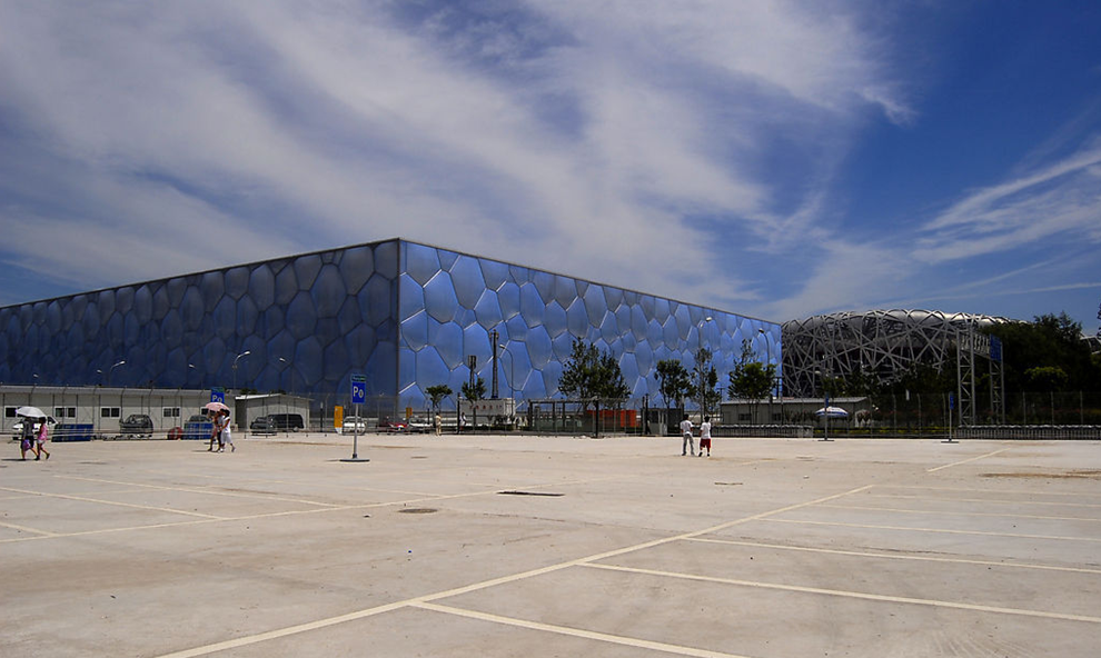 “水立方”與“鳥巢”只有一路之隔,一方一圓,一藍一紅,形成了一種微妙、均衡的關系。中方主設計師趙小鈞先生介紹說,就設計過程來說,是先有‘鳥巢’,所以,一開始做這個設計,關于如何跟‘鳥巢’形成一個和諧的、統(tǒng)一的、對比的、互相映襯這樣一個關系,就是大家重點討論的一個方面。