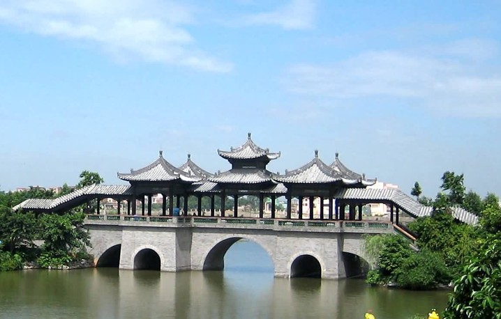 粵暉園歸水橋位于無(wú)香湖與映月湖交接的堤岸上,下設(shè)水閘,勢(shì)納東江,隨東江潮汐而變,換凈園水,永葆園內(nèi)水質(zhì)長(zhǎng)清,故稱(chēng)歸水橋。有詩(shī)為證:“橋自東江歸碧水,園從正道入青蚨”。歸水橋獨(dú)具嶺南特色,形象豐富。橋上架五亭如梅花布置,橋身用青石砌成,下由十二個(gè)大小不同的橋墩組成十五孔,平面呈“工”字形,兩側(cè)加階梯,橋面上矗立琉璃攢尖方亭五座,正中的主亭為重檐,其四角為單檐。每逢月滿,從正側(cè)橋孔觀望,每洞各映一月,金色晃動(dòng),眾月襯橋,使湖景更為美麗。歸水橋也是接通繞翠廊的關(guān)口,橋面相對(duì)前園高出3米多,這樣即使無(wú)香湖四周景觀高低起伏,又使繞翠廊有層次感,高低疊立,倚橋亭遠(yuǎn)眺,視野開(kāi)闊,園內(nèi)美景盡收眼底。正是“水應(yīng)園生,園因水活”。