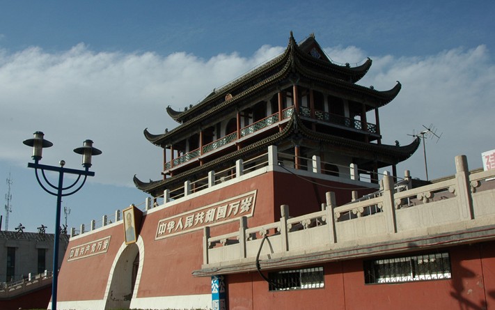 又稱“南門樓”,位于寧夏銀川城東南的南環(huán)東路與中山南街交叉口上,坐北朝南,面臨廣場。門樓通高27.5米,下為高7米的長方形券門洞臺基(東西長37米,南北寬28.1米),臺基北面門洞兩側(cè)筑有對稱臺階,以便登臨其上。高大臺座上是歇山頂?shù)亩又亻軜情w,高20.5米。