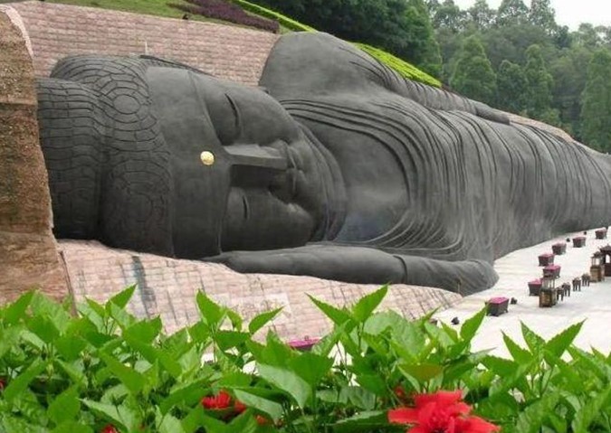 大臥佛位于森林公園天仙巖。相傳當(dāng)年佛教大師六祖惠能傳教后深夜經(jīng)過這里,看到天仙巖靈光閃爍,隱約可見這塊橫臥的大石塊就是一個(gè)大臥佛,六祖立即跪拜,求佛祖降福天下。大臥佛的雕造從這個(gè)傳說(shuō)獲取靈感,以盛唐敦煌臥佛為范本,佛身長(zhǎng)108米,尺度堪稱世界之最?,F(xiàn)經(jīng)改造用紫銅包裝大臥佛,成為金裝大臥佛。大佛前面是錦鯉池和荷花池,與大佛相互映襯引人入勝。大佛對(duì)岸一層為長(zhǎng)六十米的長(zhǎng)廊,廊內(nèi)彩繪佛傳故事,二層為敬佛臺(tái),憑欄對(duì)拜,大佛全景一覽無(wú)遺。